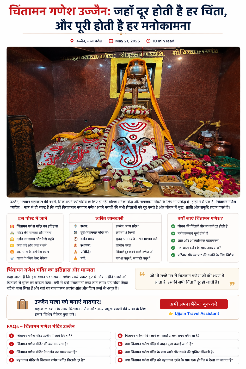 चिंतामन गणेश मंदिर उज्जैन का एक ऐसा धार्मिक स्थल है जहां हर भक्त शांति और उम्मीद लेकर आता है। यहां का वातावरण, प्राचीन इतिहास और गणेश जी की मान्यता इस मंदिर को बेहद खास बनाती है। अगर आप उज्जैन की यात्रा कर रहे हैं, तो इस मंदिर को अपने ट्रिप प्लान में जरूर शामिल करें।